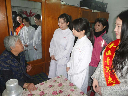 为培养同学们敬老、爱老、养老、助老的传统美德,将乐于助人、无私奉献的“雷锋精神”发扬光大,2015年3月19日,护理学院2013级护本第一志愿者服务队开展了以“‘迎春风 送温暖’走进大老虎沟社区,慰问高龄老人”为主题的志愿者活动。 志愿者们来到大老虎沟社区,给老人们带去了亲切的问候,利用自身专业优势,搭建起临时体检小站,免费给老人们测量脉搏、血压,给老人们听诊等,告知老人们的身体健康情况,并且细心地给予老人们合适的健康指导。志愿者们另分成三组上门帮助高龄老人,热心的同学们不仅给老人捶背、聊天,还为老人们打扫卫生、做家务。老人们被志愿者们的热情所感染,脸上漾起欣慰的笑容。 “最美不过夕阳红”,只要我们都伸出热情之手,关爱和帮助老人们,就能使他们感受到社会的温暖。这次的活动只是护理学院2013级护本第一志愿者服务队爱心路上的一部分,志愿者们会把活动一直继续下去,让温暖持续!