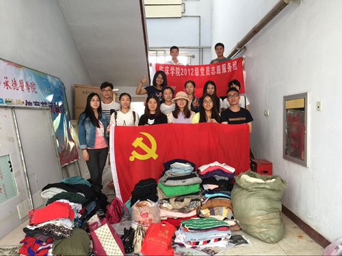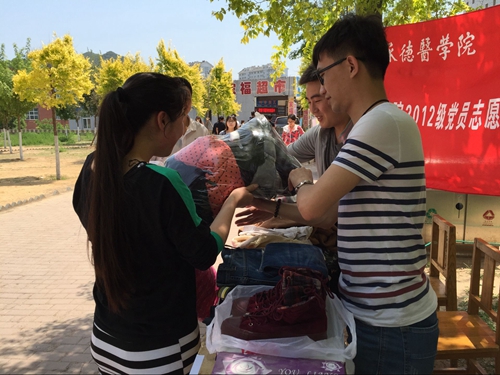 2016年5月22日,临床学院2012级党支部第15、16党小组在大学生活动中心成功举办爱心捐赠活动。 上午11:30活动正式开始,随后便陆续有同学赶来捐赠,一件件虽不是崭新却十分整洁的衣服由同学们仔细叠好装在袋子里送来,那不仅是衣物更是满满的爱心.下午,党小组组员被分成四组,轮流在大学生活动中心门口等待“爱心”到来,活动一直进行到下午5点,天气炎热却阻挡不住同学们献出自己爱心的脚步。 活动后,党员们对募捐来的物品进行了分类整理工作,据不完全统计,此次活动一共募集秋冬季上衣棉服80件、裤子95件,春夏季上衣109件,背包3个,帽子2个,被子2套,毛毯1条,呼啦圈1个,保温杯1个,鞋30双。这些聚集的“爱心”将随后由承德市爱心联盟暂为接收保管,最终送给需要它们的朋友。 临床学院2012级党支部第15、16党小组的全体党员们本着“凝聚爱心,无私奉献”的精神,在即将离别校园之际又一次做了实实在在的志愿者服务活动,用实际行动践行着当初在党旗下立下的誓言。