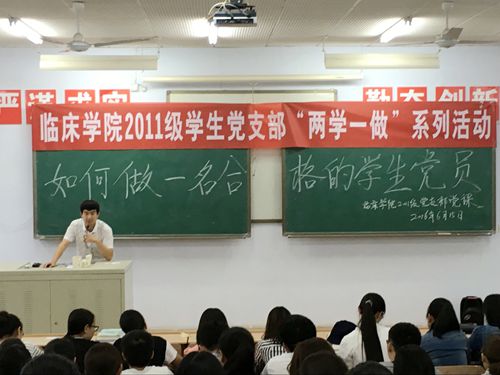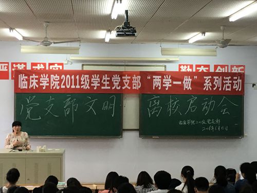 毕业临别之际,为加强对毕业生党员“两学一做”的学习教育,进一步提高毕业生党员的党性修养,加强毕业生尤其是党员理想信念教育,培育毕业生党员爱校荣校意识和校友意识,激励毕业生党员继承和发扬承医优良传统,增强党员意识,树立承医形象,引导毕业生在今后的学习和工作岗位上时刻以承医学子的身份鞭策自己,增强毕业生继续为母校做贡献的责任感、使命感和荣誉感。2016年6月15日下午,临床学院2011级学生党支部在教学楼105教室开展以“为党旗争辉 向母校献礼”为主题的“两学一做”系列活动,党支部书记张鹏老师、组织委员李静老师以及全体学生党员共计125人参加活动。 本次党支部活动共分为四个环节。首先张鹏老师就如何做一名合格的共产党员向党员们进行了讲解。他带领学生党员重温党史、党章、入党誓词和习总书记系列讲话,告诉学生党员应牢记党的宗旨,不忘责任使命,强化党员意识,践行庄严承诺。他还强调学生党员思想上要明确共产主义的理想信念,在政治立场上要与党中央保持一致,在党言党;学习上认真学习党中央方针政策、党史等相关内容,同时注重自己的专业学习,做到自主学习、终身学习;工作上践行群众路线,注重医德培养,做到爱岗敬业;生活上做到勤俭节约,提高自身修养,乐于助人。他鼓励毕业生党员分享自己在大学期间的心路历程,总结大学生活得失,规划今后的工作、学习和生活,鼓励毕业生党员牢记宗旨,牢记嘱托,在今后的学习、工作中继续发挥模范带头作用,争取为党旗添彩,为母校争光! 第二个环节是由李静老师主持召开的党支部文明离校启动会。李静老师指出“两学一做”基础在学,关键在做。为营造和谐文明、安全有序的离校环境,毕业生党员要充分发挥模范带头作用,在返校期间严格要求自己,严肃考风考纪,注意宿舍卫生,用实际行动带动广大同学共同营造良好的毕业离校氛围,做到感恩怀德,文明离校。 第三个环节是学习李保国精神,张鹏老师详细介绍了李保国生平事迹,突出强调了他身上的三点精神:扎根基层、扶贫和科技创新。呼吁全体学生党员向李保国同志学习。 第四个环节是由李静老师主持召开的我为母校献言献计活动,向毕业生发出一份倡议,号召毕业生怀感恩之心、树自身形象,自觉遵守学校的各项规章制度,积极开展有意义的活动,为学校留下美好的回忆。学生党员以小组为单位展开讨论,并以文字的形式向母校提供自己的意见。 活动的最后,两位老师重点强调了毕业后相关事项,并就党关系转出相关事项做了详细说明。 活动结束后,学生党员纷纷表示了自己的看法。他们均表示了自己对母校的热爱以及临别之际的不舍,最后一次的党支部活动使他们受益匪浅。一名学生党员说道:“五年的大学时光稍纵即逝,每一次的党支部活动,都是给自己一次全新的洗礼。自从成为一名中共党员,我们无时无刻都能感触到自己身上的责任与使命。我们为身为一名优秀的学生党员而感到骄傲与自豪。这次的活动使学生党员进一步增强了政治意识、大局意识、核心意识、看齐意识,坚定了理想信念。”一名学生党员说道:“通过深入学习和重温学校的光荣历史和发展沿革,牢记校训和承医精神,并使之内化为每个毕业生党员的优秀品质,加强党性修养,使我们在走向社会后自觉践行。”两位老师对毕业生党员提出新的希冀:“大家应树立毕业生党员形象,发挥毕业生党员的先锋表率作用,时刻注意保持自身的先进性和纯洁性,将个人发展同集体和社会的发展积极结合起来,投身于新形势下伟大复兴中国梦的建设中来。”毕业生党员纷纷对母校与老师送上了真挚的祝福,祝福老师们身体健看,阖家欢乐,桃李满天下;祝愿母校蒸蒸日上,再谱华章!