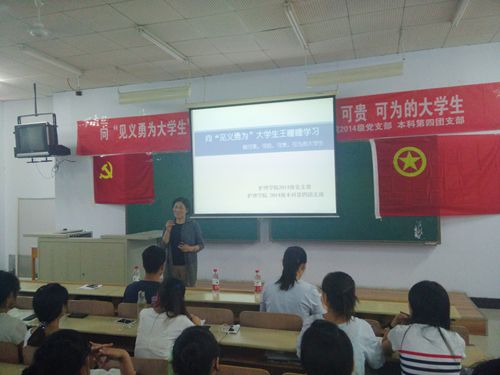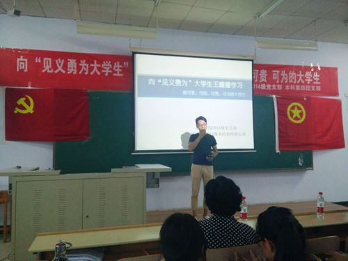 2016年5月22日, 一对母子在承德避暑山庄水心榭湖落水双双陷入险境。承德医学院2015级医学生物技术班学生王瞳瞳,不顾个人安危,关键时刻,挺身而出,将落水母子奋力救出后,未留姓名,悄然离去。事后,王瞳瞳见义勇为,勇救落水母子的事迹在社会及校内外师生之间引起强烈反响,多家媒体报道,广大网友为其点赞。为表彰王瞳瞳同学的先进事迹,学校党委授予他“见义勇为大学生”荣誉称号;承德市双桥区文明办授予他“双桥好人”荣誉称号;承德市人民政府授予他“承德市2016年见义勇为模范”荣誉称号;中共河北省委教育工委、河北省教育厅授予王瞳瞳“见义勇为”大学生荣誉称号;王瞳瞳荣登中国文明网“中国好人榜”5月榜。 为响应中共河北省委教育工委、河北省教育厅下发的关于组织开展向王瞳瞳同学学习活动的通知和学校党委的号召,2016年6月30日,护理学院2014级党支部 、护理本科第四团支部举办向“见义勇为”大学生王瞳瞳学习,做可爱、可信、可贵、可为大学生”主题团日活动。护理学院2014级本科第四团支部全体,第一、二、三、五、六团支部部分同学参加此次活动,护理学院2014级党支部书记晏凤春、辅导员齐新玉老师出席活动,生物医学工程系2015级医学生物技术班王瞳瞳作为特邀嘉宾来现场与同学交流见义勇为的心路历程,全场共计百余人。 王瞳瞳先进事迹在现场通过PPT展示的方式再次呈现在大家面前,使全场学生敬佩与感动,引发广大学生深入思考。热烈的掌声过后,王瞳瞳本人就自身见义勇为行为进行发言,他坦诚地说:“救了两个人,自己感到很欣慰,但当时就是单纯地想救人,并没有想到日后会得到这么多的关注、鼓励与关怀。”他的率真、谦恭令人敬佩。 护理学院2014级6位学生代表和辅导员齐新玉老师就王瞳瞳救人事件发表各自见解,演讲精彩纷呈,引起现场阵阵掌声。护理学院2014级党支部书记晏凤春老师讲到,王瞳瞳同学就是我们身边学习的榜样,我们要学习他临危不惧、见义勇为、舍己救人的崇高精神和传统美德,学习他心系社会、关爱他人、乐于奉献的优秀品质。同学们要从他的先进事迹和崇高精神中汲取力量,完善自己,努力把自己锻炼成为全面发展的高素质护理专业人才,为学校与社会的发展进步做出贡献。 向“见义勇为”大学生王瞳瞳学习,做可爱、可信、可贵、可为大学生主题团日活动,运用身边的典型,生动、鲜活地弘扬了见义勇为的精神,发挥了先进典型的示范引领作用,让广大青年学生从王瞳瞳同学的先进事迹和崇高精神中受到鼓舞,自觉践行社会主义核心价值观,牢固树立科学的世界观、人生观、价值观和荣辱观,用“中国梦”凝聚正能量,努力成为全面发展的社会主义事业合格建设者和可靠接班人收到好的效果。