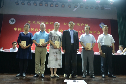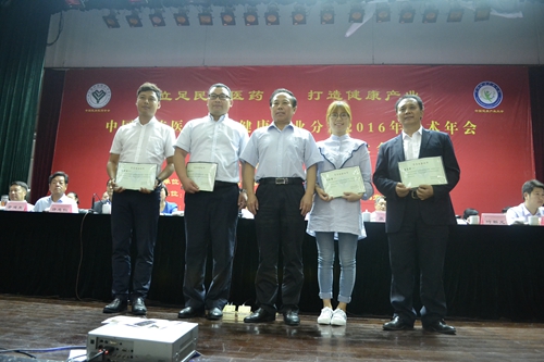 大会颁发中国民族医药学会健康产业分会副会长证书,中医学院李静华(左一)上台领取证书