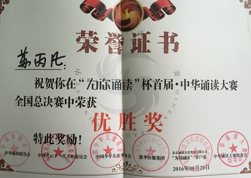 “为你诵读”杯首届中华诵读大赛全国总决赛暨颁奖盛典于2016年8月27日-28日在中国现代文学馆举行。本次大赛由中华诵读联合会、中国关心下一代工作委员会、中国少年儿童基金会、歌华传媒集团共同主办,北京诵读文化发展有限公司“为你诵读”客户端承办。大赛旨在发现更多适合诵读的文学艺术作品,并选拔出更多优秀的诵读人才。 经过层层的选拔,我校中药学系教师教师苏丙凡脱颖而出晋级全国总决赛,在总决赛中诵读了《忍住了看你,却忍不住想你》,获得第11名,荣获优胜奖。 首届“中华诵读大赛”参赛情况非常活跃,共有58000多名选手参加了设置在“为你诵读”客户端软件上的线上选拔赛,最后200多名选手获得了参加全国总决赛的资格。
