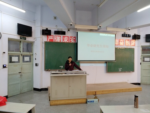 为提高我校硕士研究生学位论文质量,保障硕士研究生顺利毕业及就业,2017年12月7日上午9时,研究生学院在教学楼109教室召开2015级全体硕士研究生毕业前工作会议,研究生学院院长王瑞婷、党总支书记李德臣、招生就业办公室、培养办公室、学生科全体老师及2015级206名硕士研究生参加了此次会议,会议由学生科王婧老师主持。 会上,王瑞婷院长介绍了国务院学位办、省学位办为提高研究生培养质量所出台的相关政策及措施,如学位授权点的评估和论文抽检等相关政策。展示了我校近几年硕士研究生论文盲审和论文抽检中所存在的问题。针对所存在的问题,王瑞婷院长按照学位论文的结构和顺序,并结合往年学位论文中的错误案例,向2015级硕士研究生介绍硕士毕业论文撰写中常见的错误,要求学生高度重视,认真写作,保障学位论文的质量。李德臣书记着重强调了研究生学术道德与学风建设,学术不端、论文作假等情况的相关处分规定,对2015级全体研究生进行了科研诚信和鼓励教育。杨松鹤老师针对有关硕士学位论文评审,论文答辩等材料的书写以及论文查重、送审、学位信息申报程序等方面对2015级全体硕士研究生进行学术规范教育。会后,向学生们发放了就业协议书以及毕业相关表格。 此次2015级全体硕士研究生毕业前工作会议的召开,体现了我校对学生工作的高度重视。2015级全体硕士研究生表示此次工作部署使他们感受到毕业即临的紧迫感,他们将谨记研究生学院教师们的孜孜教诲,端正学术态度,以科学、严谨、求实的心态完成毕业论文的撰写与答辩,不辜负老师们的殷切期望。