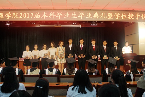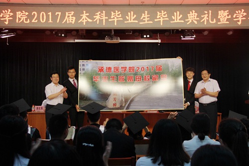 大雨倾盆却依然无法阻挡毕业时刻的临近,全体2017届本科毕业生们在雨中迎来了大学生活的最后一天。2017年6月23日上午,我校在图书馆八楼多功能厅举行了2017届本科生毕业典礼。党委书记刘永平,校长曹凯,副校长谢利德、唐世英,学校党委常委、附属医院院长郝长来出席了典礼。学校有关职能部门、院(系、部)负责人、辅导员及2017届本科毕业生代表参加了典礼。学生处处长沈浩主持毕业典礼。 毕业典礼在庄严的国歌声中拉开帷幕。副校长唐世英宣布了学校2017届本科各专业毕业生名单、授予学士学位者名单。副校长谢利德宣读了2017届河北省优秀毕业生名单以及第八届全国高等医学院校大学生临床技能竞赛(华北赛区)获奖选手名单。在热烈的掌声中,校领导为毕业生代表颁发了毕业证书和学位证书,并为荣获“河北省优秀毕业生”荣誉称号的毕业生代表颁发证书。党委书记刘永平为在第八届全国高等医学院校大学生临床技能竞赛中获奖的选手颁发证书。全体2017届毕业生为母校赠送了纪念品——写有“涟芳桥”的景观石,感谢母校养育之恩,祝愿母校繁荣长久。学校党委书记刘永平、校长曹凯代表学校接受礼品。 2012级临床医学专业马静同学代表全体毕业生发言。她表达了对母校、老师、父母的衷心感谢。回忆了五年来在承医学习、生活、拼搏的点点滴滴。为承医和承医学子们送上了美好祝愿,并号召全体毕业生们秉承校训和承医精神,运用所学知识,在不同的岗位上为母校增光添彩,回报社会,回报母校。 基础医学院2014级临床医学专业郭明宇同学代表全体在校生发言。向即将离开母校的,曾经帮助、关怀、引领自己及同窗们的学长、学姐表达了由衷的问候和祝愿。祝福学长、学姐们继续开创美好的未来,成就幸福的人生,向世人,向社会,展示承医学子的独特风采。 外语教学部胡静波老师代表全体教师发言。他带领大家一同回忆了大学时光,感慨时光飞逝,青春短暂。他将自己的感悟分享给毕业生们,希望能够在同学们即将开始一条崭新的未来之路时帮到他们。他讲述了自己的经历、见闻、思考,告诉同学们懂得尊重,懂得珍惜,懂得敬畏。祝愿大家一路顺风,欢迎同学们常回家看看,承医敞开怀抱,迎接大家。 校长曹凯深情地对2017届本科毕业生们送上学校领导、老师对他们的不舍、嘱托与希望。他细数了2017届学生们在五年间取得的优异成绩,为学校做出的突出贡献。肯定了同学们用笃学不倦、自强不息的行动,生动地诠释了承医优良的学风和校风。为同学们在毕业之际,收获成长、收获友谊而欣慰和高兴。他作为校长同时也是作为77级的承医学生,作为毕业生们的学长,将千般牵挂化为嘱托,希望同学们读好三本书。一是读好有字之书,静下心来读书学习,沉淀积累、厚积薄发,遇到更好的自己;二是读好无字之书,要善于分析、冷静思考、科学判断,耐得住寂寞、经得起失败、受得起挫折,以诚立人,以德立身;三是读好心灵之书,将对祖国和人民的无限忠诚化作内心的光明,将对生命的敬畏化作内心的温暖,将滤去浮躁、心灵的安静化作内心的力量。他祝愿同学们在实现中华民族伟大复兴的历史洪流中,勇立时代潮头,再谱青春诗篇。 2017届的毕业生们就要告别熟悉的校园,告别朝夕相处的老师和同学们,无限广阔而美好的前景正展现在你们面前。“海阔凭鱼跃,天高任鸟飞。”愿大家志存高远、直面挑战、脚踏实地、勇于奉献,真正把校长的殷切寄语和老师们的谆谆教诲化作今后不断前行的动力,在充满希望的明天,书写人生最为华美的诗篇。
