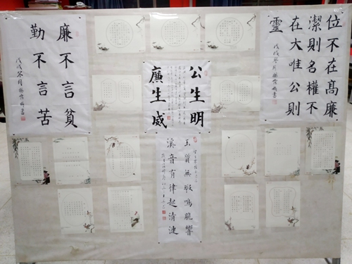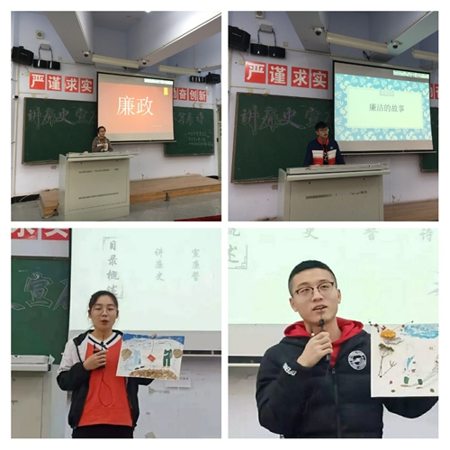 “书瀚墨飘香 展廉洁文化”书法作品展览 “讲廉史 宣廉誓 写廉诗”故事接力活动以大学生为主体,演讲形式为窗口,将有关廉洁思想的历史文化一脉相传。经全校招募选拔,共有11位主讲人参加本次活动,从受人爱戴的宋国司城子罕,讲到清正廉洁的杨震,从一尘不染、两袖清风的党员楷模孔繁森,再到铁面无私、流芳百世的清官包拯,主讲人的故事接力深刻诠释了,作为中华儿女的根,就应该将我们的优秀文化永远传承。随后,全体成员在主持人的带领下进行了庄严的廉洁主题宣誓。最后,由工作人员发放书签,大家将提前准备的廉洁主题的古诗词在书签上留言,这些书签发放到了图书馆自习室、阅览室等各处面向全校师生免费提供使用,廉洁精神在校园内流传开来。