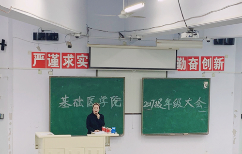 基础医学院2017级辅导员杨捷老师作诚信教育 此次年级大会的召开,加深了同学们对学习重要性的认识,促进同学之间互帮互助,增进同学们之间的感情,营造良好的学习氛围,树立了同学们诚信应考的意识,加强了同学们的安全意识,号召大家共同努力展现基础医学院2017级的良好学风、考风及诚信、尊师的美好品德。