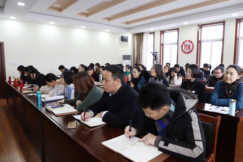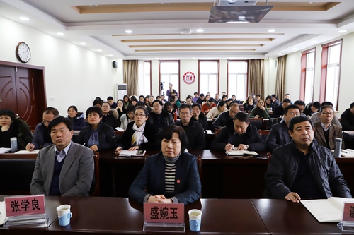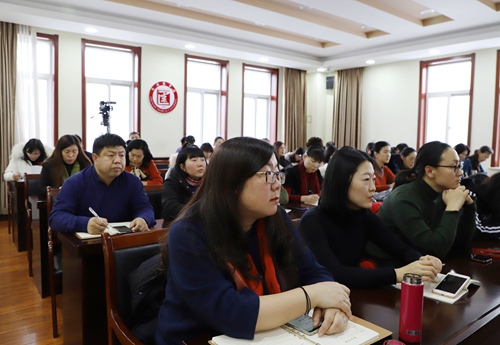 党委书记盛婉玉、副书记谢利德、张学良与全体副处级以上干部、思政课教师、辅导员老师聆听了报告