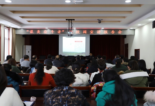 为深入学习贯彻习近平新时代中国特色社会主义思想和党的十九大精神,全面落实习近平总书记在全国教育大会、全国高校思想政治工作会议、学校思想政治理论课教师座谈会上的重要讲话精神,发挥新时代先进人物的榜样示范作用,弘扬“幸福源自奋斗、成功在于奉献、平凡造就伟大”的价值理念,凝聚万众一心奋斗新时代的强大力量,根据中共河北省委宣传部、河北省教育厅等7部门关于组织开展“奋斗的我 最美的国”新时代先进人物进校园的要求,2019年12月25日下午,学校邀请获得“最美奋斗者”荣誉称号的“塞罕坝机械林场先进群体”代表——塞罕坝机械林场副场长于士涛来校为师生作报告。党委书记盛婉玉、党委副书记谢利德、张学良出席报告会。全体副处级以上干部、思政课教师、辅导员参加报告会。党委宣传统战部部长于多珠主持报告会。