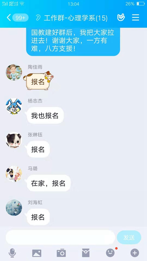 学校办公室发出教师志愿者倡议,生物医学工程系、心理学系教师瞬间 完成志愿者报名(图为心理学系教师在工作群里的报名情况部分对话截图) 作者:宣传部 王海民 编辑:宣传部 范萌 | ||||||||