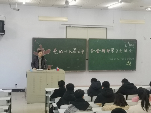 为深入学习宣传贯彻党的十九届五中全会精神,积极响应学校及上级党委的号召,基础医学院2019级学生党支部以线上学习宣传+线下交流讨论的形式开展了十九届五中全会学习研讨活动。 11月28日,基础医学院2019级学生党支部在教学楼206室举行了党的十九届五中全会学习交流活动,学生党支部潘瑞兵老师及2019级团学骨干参加了此次会议。潘瑞兵向同学代表讲述了十九届五中全会精神,强调了全会提出的坚持党的领导,科技自强自立,拥有创新精神仍是在我国现代化建设全局中的核心地位的重要性,并希望团学骨干通过此次学习,可以更加了解十九届五中全会精神,加强理论知识学习,提升政治素养,在今后的学习和生活中发挥模范带头作用,并以此次交流会为契机,组建学习小组掀起学习十九届五中全会的热潮。