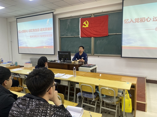 为进一步加强党员党性修养、回忆党组织的的培养历程、强化党员宗旨意识,激发党员的工作热情和无私奉献的精神,2020年11月28日,临床学院2017级学生党支部于承德医学院附属医院教室开展“忆入党初心 过红色生日 话党员情怀”主题党日活动。临床学院党委副书记陈学武、临床学院2017级学生党支部书记于海龙、纪检委员杨捷参加本次活动。党员代表张铭同志主持,支部全体党员、预备党员、入党积极分子参加本次活动。 本次活动以党员重温入党誓词为首展开,借此提醒党员同志应时刻不忘入党初心、用实际行动践行入党誓言。陈学武为过“政治生日”的党员同志们赠送了《党史必修课》作为生日礼物,希望党员同志们能够戒骄戒躁,认真学习党史有关理论知识,加强自身党性修养。三名党员代表向支部汇报一年来的思想、学习、工作、生活等情况,并许下自己的“政治生日”愿望。最后,陈学武对过“政治生日”的党员同志们发表了殷切期盼,希望同志们在思想上永远保持先进性、在行动上永远保持积极性、在工作上永远保持责任感、在品质上永远保持纯洁性。在平时要严格要求自己,以身作则,不断用行动锤炼党性,培养树立良好的品德。同时也发表了自己的“政治生日”愿望,希望在习近平新时代中国特色社会主义思想的指引下,能够不忘初心,为医学界培养高质量、高素质人才,为人民服务。