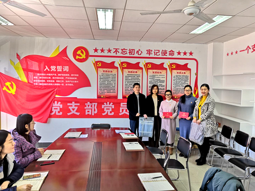 公共教学教辅党委委员王晓春和支部书记佟晓波为过“政治生日”的三名党员同志赠送“政治生日”贺卡和“政治生日”礼物