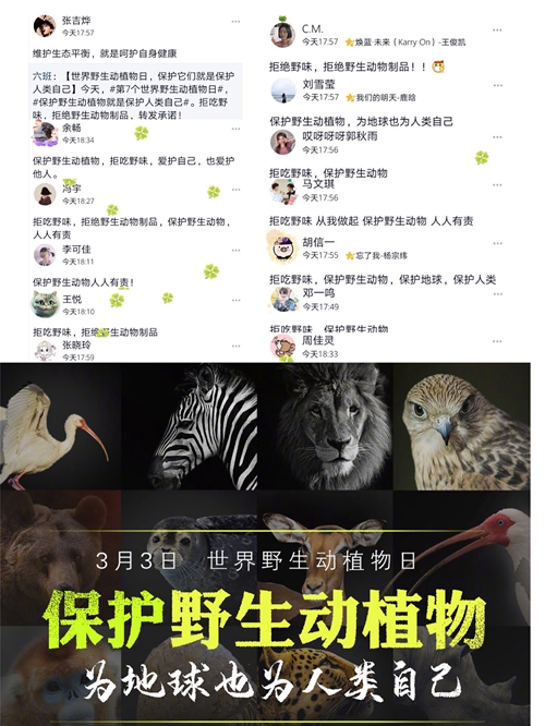 宣传保护野生动植物 不忘初心,共克时艰 疫情就是命令,防控就是责任。疫情面前,一大批承医校友和见习医院老师们作为“逆行者”奔向武汉,该志愿服务队线上开展讲述战“疫”事迹接力活动,录制致敬伟大逆行者的视频,通过空间转发、讲给身边的人,进行自我职业教育和生命教育,讲好中国故事,传播新时代正能量,激发全体志愿者坚定信心打赢阻击战。同时做到停课不停学,学习不延期,志愿者们成立学习帮扶小组,线上讨论学习问题,主动分享自己的学习笔记和学习方法。通过线上学习,尽所能帮助学习上需要帮扶的同学,给他们的学习给予指导,共克时艰,保证学习质量。