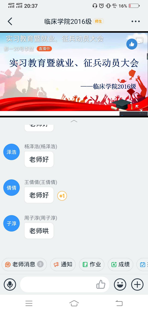 为进一步指导同学们了解就业形势,提高就业技能,转变就业观念,并号召同学们不负韶华,投身国防,逐梦军营,临床学院2016级于2020年12月31日在线上召开实习教育暨就业、征兵动员大会,临床学院2016级辅导员李静老师、贾思锋老师、罗宇老师及临床学院2016级全体学生参加会议。