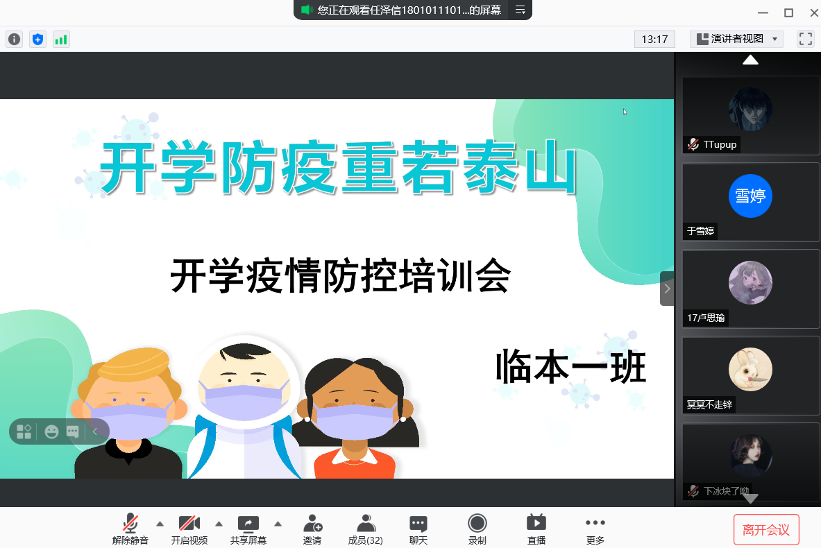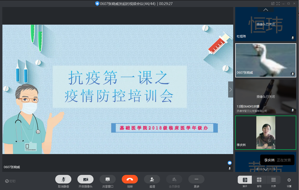 为充分认识到疫情防控的复杂性、严峻性,切实保障返校途中及返校后学生的健康和安全,配合学校做好疫情防控相关工作,充分做好开学准备。2021年3月7日,基础医学院2018级临床医学专业在线上召开开学前疫情防控会议。辅导员老师李庆林、周腾飞对相关内容进行详细说明和强调。 3月7日,李庆林老师在腾讯会议进行开学前疫情防控会议。会上,她就开学前信息上报、返程中注意事项、返校后具体流程与管理进行详细解说,重点指出让同学们加强防疫意识,按时上报体温,及时填写信息表与承诺书,同时备好防疫用品,为开学做好充分准备。李庆林老师强调,在开学前要配合学校上报相关信息,做到不瞒报、不谎报、不漏报;未取得学校允许,不得擅自返校;返程中信息要如实上报;开学后积极配合学校工作,体温异常要如实上报并就诊,确保学生复学万无一失。 基础医学院2018级临床医学专业召开疫情防控培训会议 在培训会结束后,各班学生干部及时开展班会,通过此次班会切实有效地将防疫讯息及有关知识传达到每位同学,积极落实防控知识宣传工作。 基础医学院2018级临床医学9班班会 基础医学院2018级临床医学1班班会 此次培训让学生加深了对开学前疫情防控工作的了解,提高了学生对于开学前疫情防控的重视程度,为促进学校顺利开学打下了坚实的基础。 注:所有图片点击即可获得大图 作者:基础医学院 于欣静 编辑:党委宣传统战部 范萌 审核:党委宣传统战部 王海民 | ||||||||