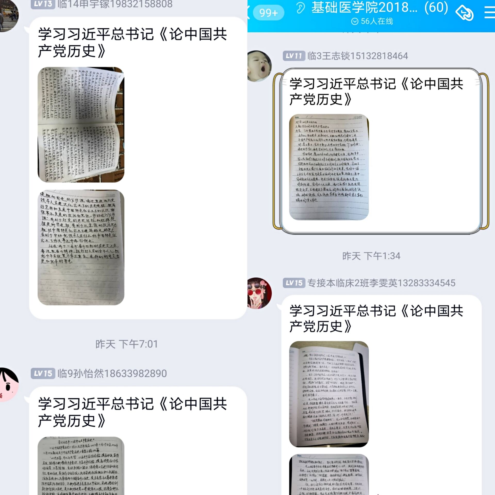 为深入贯彻习近平总书记在党史学习教育动员大会上的重要讲话精神,巩固深化“不忘初心、牢记使命”主题教育成果,引导广大党员学党史、悟思想、办实事、开新局,基础医学院2018级学生党支部于2021年4月1日至4月15日开展党员专题培训暨党史学习教育专题研讨之学习习近平总书记《论中国共产党历史》系列活动,基础医学院2018级学生党支部全体师生党员参加本次活动。 线上交流研讨 此次活动共分为两个阶段,其中4月1日至4月12日,党支部全体党员集中学习习近平总书记《论中国共产党历史》,并及时做好读书笔记,使党的光辉历史入脑入心。4月13日至4月15日,党支部全体党员线上学习交流研讨,他们一致认为:通过党史学习教育,深切感悟到我们党百年奋斗历程的艰辛,更加珍惜这来之不易的幸福生活。作为新时代青年,用党的奋斗历程和伟大成就鼓舞斗志、明确方向,进一步厚植初心,强化使命,积极投身伟大的奋斗历程,适应新的形势,完成新的任务,实现新的发展。 学习笔记 此次党史学习教育专题研讨,有助于支部党员同志增强“四个意识”、坚定“四个自信”、做到“两个维护”,不断增强政治判断力、政治领悟力和政治执行力。在接下来的一段时间内,基础医学院2018级学生党支部将继续展开系列专题研讨,使党员同志担起中华民族复兴伟业重任,争做新时代的奋斗者和追梦者。 作者:基础医学院2018级学生党支部 编辑:党委宣传统战部 范萌 审核:党委宣传统战部 王海民 | ||||||||