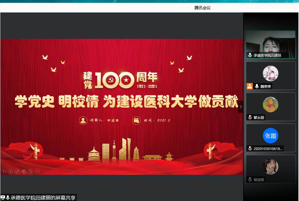 2021年5月29日,护理系党委副书记、主任田建丽通过腾讯会议线上与联系党支部和联系班级开展题为“学党史 明校情 为建设医科大学贡献力量”的党史学习专题讲座。会议由护理系学生第一党支部书记魏荣荣主持,护理系学生第一党支部全体党员和入党积极分子代表以及护理系2019级护理学2班全体同学参加学习。 田建丽从“党的历史征程中涌现的红色精神” 深入浅出地讲述了中国共产党人艰苦卓绝的奋战历程,并通过一个个生动感人的革命故事,再现了中国共产党为人民谋求解放的坚定信念以及艰苦奋斗的伟大精神。从“我校发展历史” “如何建设医科大学”两方面,激励同学们牢记党史、立足本职,以团结服务为中心任务,以促进学校更好、更快发展为出发点,以更加饱满的热情投入到工作和学习之中。整场讲座旁征博引、内容丰富,带领全体参会同学们在重温党的伟大历史的同时汲取了强大的信仰力量。 本次党史学习专题讲座进一步引导与会同志、同学们树立青年使命意识,激发爱党爱国爱校热情,真正做到脚踏实地为建设医科大学贡献力量。 (点击图片即可查看原图) 护理系党委副书记、主任田建丽作党史专题讲座 参会人员认真学习中 作者:魏荣荣 耿鑫湲 编辑:党委宣传统战部 范萌 审核:党委宣传统战部 王海民 | ||||||||