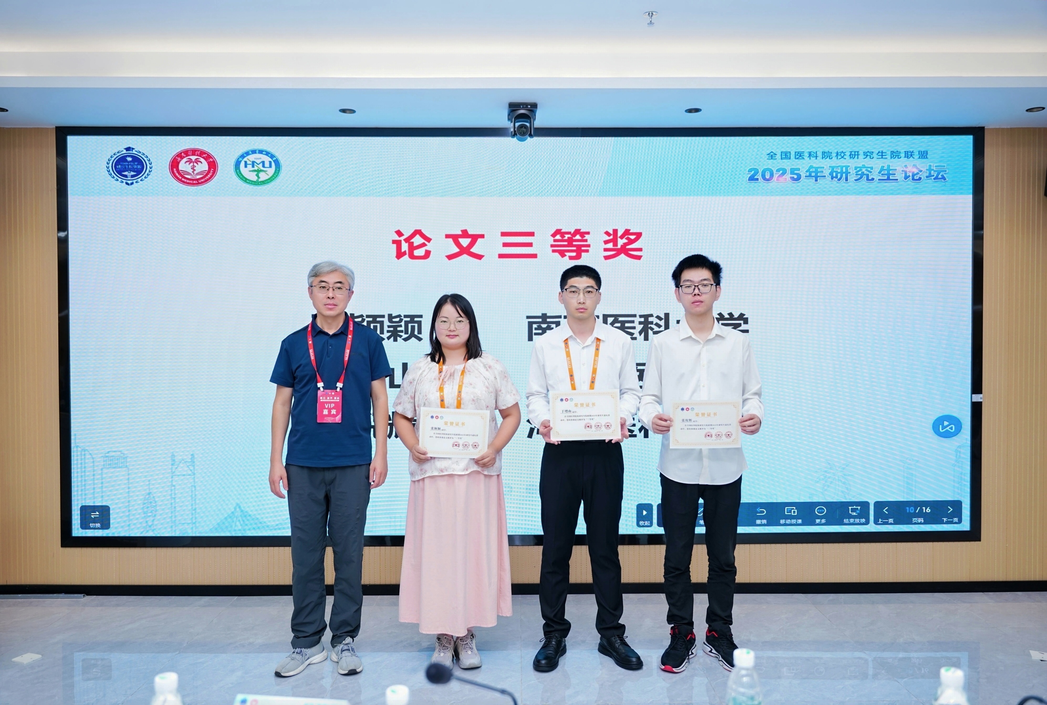 11月1日,由全国医科院校研究生院联盟主办,海南医科大学与哈尔滨医科大学承办的“青年创见赋能生命健康——全国医科院校研究生院联盟2025年研究生论坛”在海南海口成功举办。本次论坛以“融合·破界·领航:青年创见赋能生命健康”为主题,吸引了全国56所医科院校的1330名优秀研究生参加。大赛设立临床医学、基础医学、药学、公共卫生、医学技术及智能科学、护理学、中医学等7个分论坛。 获奖学生合影 我校研究生的成果获得了与会专家和师生的高度评价,其中2023级中医专业硕士研究生朱富群荣获论文二等奖,2024级生物医学工程硕士研究生于增山荣获论文三等奖,2023级中医专业硕士研究生祁彤、2024级生物医学工程硕士研究生郭珊荣获论文优胜奖,并受邀在分论坛做学术报告,展现了承医学子的科研实力与创新风采。 本次论坛不仅体现了我校在研究生培养和科研创新方面的扎实功底和显著成效,也展现了新时代医学研究生在交叉学科与前沿领域的探索精神,为学校赢得了荣誉,为推动医学科技的进步贡献了青春力量。 作者:研究生学院 崔海鹏(单位审核:苗光新) 编辑:党委宣传统战部 张喜子 审核:党委宣传统战部 周文娟 | ||||||||