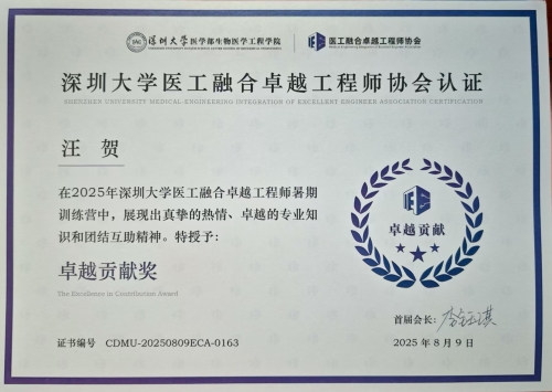 2025年8月9日,“2025医工融合卓越工程师暑期训练营结营与等级认证仪式”在深圳大学举行。作为“卓越工程师”培养系列标杆项目,本次训练营为期一个多月,吸引了全国15个省份、28所高校的500余名师生参与。生物医学工程系10名优秀学生,在该系杜丽莉、刘强两位老师的带领下积极参训,取得了优异成绩。 (点击每张图片即可查看原图) 2025深圳大学暑期训练营合照 10名参加训练营的学生,凭借扎实的专业功底与出色的实践能力,成功通过审核并被认定为 “初级工程师”。这一成果充分彰显了我校学子对医工融合基础理论知识的稳固掌握与灵活运用,也展现了学校在相关领域人才培养上的扎实成效。 为我校学生颁发初级工程师证书 训练营中,汪贺同学以助教身份热情答疑,助力学员攻克难关,因突出表现荣获 “2025 暑期训练营卓越贡献奖”。据悉,本期训练营仅 9 人获此殊荣。 汪贺同学作为代表发言 汪贺同学卓越贡献证书 此期训练营虽已落下帷幕,但“承德医学院-深圳大学”联合创新培养教学模式为我校人才培育开启新篇章。医工融合作为卓越工程师培养体系的关键突破口,价值显著。而此次暑期训练营是实践教学联盟聚焦跨学科人才成长的坚实平台,将持续助推工程人才发展,赋能医工领域创新。 作者:生物医学工程系 贝翠琳 审核:党委宣传统战部 周文娟 | ||||||||